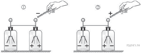 Два незаряженных электроскопа соединены проволокой. К одному из них подносят заряженную палочку. Заряды, которые могут находиться на палочке и на листочках электроскопов,