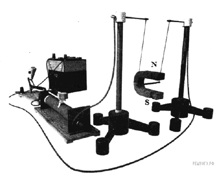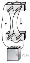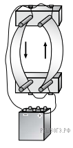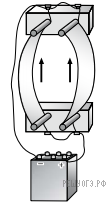 — синус угла между вектором магнитной индукции и направлением тока. Таким образом, на АБ сторону рамки и сторону параллельную ей будут действовать силы, равные по величине, но противоположные по направлению: на левую сторону «от нас», а на правую «на нас». На остальные стороны силы действовать не будут, поскольку ток в них течет параллельно силовым линиям поля. Таким образом, рамка начнет вращаться по часовой стрелке, если смотреть сверху.